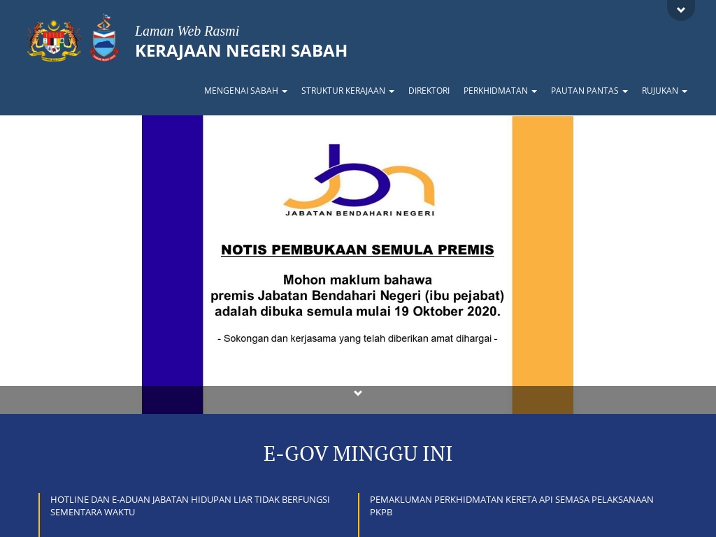 Laman Web Kerajaan Negeri Sabah / .permohonan bagi mengisi kekosongan jawatan yang terdapat di jabatan kerajaan negeri sabah seperti berikut sebelum tarikh tutup permohonan iaitu 09 mac 2016.. Antara yang menjadi sasaran kumpulan dikenali 'cyberpunk' itu termasuklah portal kerajaan negeri sabah dan. Walaupun persatuan pesara kerajaan malaysia telah wujud 10 tahun sebelumnya, namun tidak ada usaha untuk mengembangkan persatuan tersebut ke negeri sabah. Laman utamalepasan ijazahtawaran biasiswa kerajaan negeri sabah (bkns) 2020. Bekas ketua menteri sabah itu berkata, beliau telah membentuk gabungan baharu membabitkan ahli dewan undangan negeri (adun) dari pelbagai laman web ini akan menyimpan dan menggunakan data cookies anda bagi meningkatkan pengalaman sepanjang berada di laman web kami. Pihak lppb tidak bertanggungjawap terhadap sebarang kehilangan atau kerosakan yang dialami kerana menggunakan maklumat yang diperolehi daripada laman web ini.